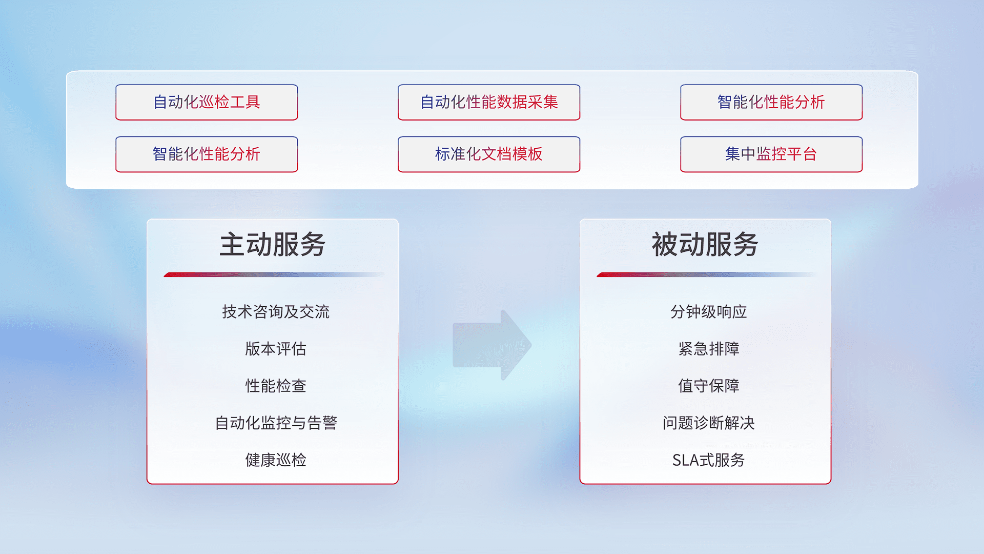 智能化工具和标准化文档,,,保障服务质量,,,提供主动服务(包含技术咨询、、、、版本评估、、、性能检查、、自动化监控与告警、、健康巡检)和被动服务包含(分钟级响应、、、紧急排障、、值守保障、、问题诊断解决、、、SLA服务)。。。。